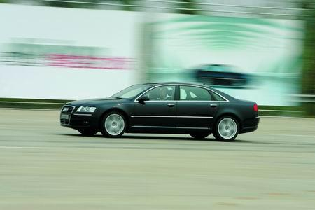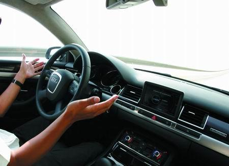 体验刹车的时候我也尽量晚刹,刹停时紧追着前面一辆车的尾部。在一条长长的直线后,我距离前车只有不到十米才踩下刹车,可能前车也突然想试验一下急刹车,车速猛然慢了下来。我心里估计我的车应该在将将能撞上前车之前停下,可是前车的尾部还是像一块巨大的石头向我们飞来。郭政情急之下嚷到:“慢!慢!”在他第二个“慢”的尾音里,A8稳稳地停在原地,我们俩的身体也稳稳贴在座椅靠背上,没有任何前倾。