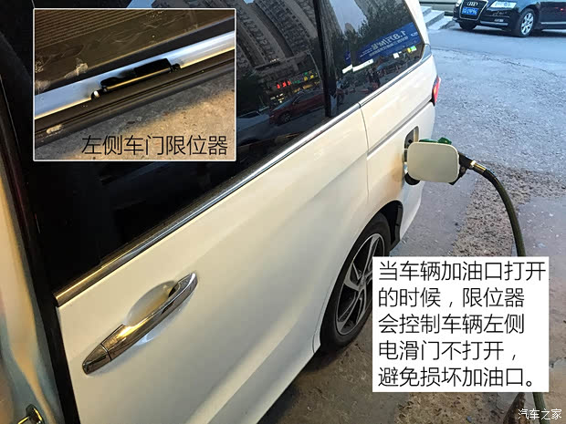 这个配置可能是大家不太关注的,各位车主可以在车的左侧侧滑门下部看到这个东西,他的作用就是当你打开油箱盖(位于车辆左侧)的时候,左侧滑动门只会打开一半,从而避免在在加油时发生危险。
