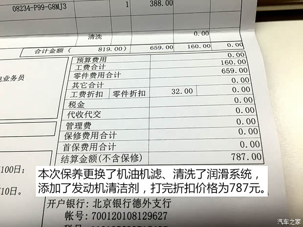 我的车开了7800多公里(保养间隔为5000公里或者半年,上次我保养里程是2800公里。),进行2保了,在二保进行的项目依旧是机油机滤的更换,同样使用全合计机油,这次费用为787元(工时费打9折)。