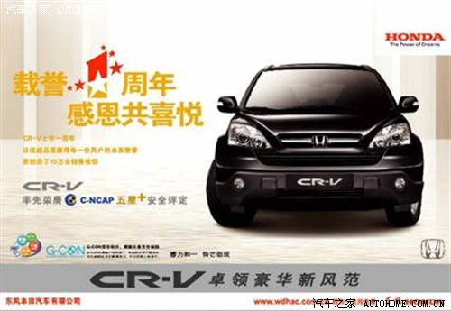 自07年上市至今,CR-V已走过一年的非凡里程!值此CR-V上市一周年之际,东风Honda特在全国特约店举办“载誉一周年,感恩共喜悦”活动,以表示对广大用户的深深谢意。活动期间,已购车用户和新购车用户可以在各特约店享受精心的爱车养护服务,更有机会获得超值大礼!