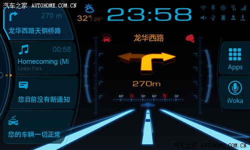 上汽inkaNet3.0的主界面有了极大的简化,左边是四个触控快捷区,分别是导航、音乐、信息、和自定义调节。中间则是当前道路信息和仪表信息,右边则是APP快速入口和iVoka语音控制。顶部还有大大的时间显示和天气显示,右边则是后台运行程序的小图标。由于上汽inkaNet系统是基于Android平台进行开发的,所以大多数的APP都可以通过在线应用商店下载并安装,可以像给自己智能手机安装应用一样在上汽inkaNet系统中安排其他应用,包括微信、微博、PPS甚至游戏。