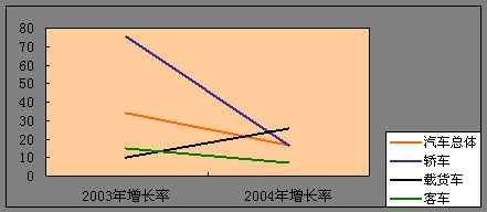 2004年中国汽车市场的总体增长速度与2003年相比有了较大幅度的下降,整体市场增长降到了16.91%,其中增长速度下降最快的是轿车市场,从2003年的75.28%骤降到2004年的16.9%。