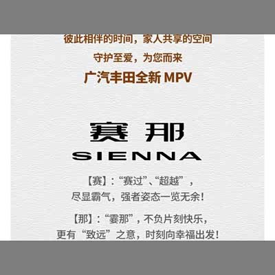 [汽车之家 资讯] 6月20日,广汽丰田官方宣布了旗下即将推出的全新MPV车型Sienna的中文名字——赛那,这款车就是海外Sienna的国产版本,预计于年内发布,年内正式上市。除了未来的广丰版本,一丰版的Sienna也有计划推出。