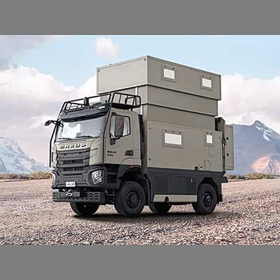外观方面,新车基于上汽重卡红岩改造而来,并采用岩石灰防爆装甲漆车身涂装。房厢部分具备坚固机甲堡垒风格,整体造型棱角分明。周身配有前后钢制保险杠及侧裙,标配双17000磅电动绞盘,此外,其还拥有双层升顶及270度尾部扩展平台等设计。