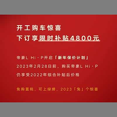 [汽车之家 资讯] 日前,我们从吉利官方微信公众号处了解到,定位为紧凑型轿车的帝豪L 雷神Hi·P推出新年保价计划,用户在2023年2月28日前购买帝豪L 雷神Hi·P仍享受补贴4800元。作为了解,目前该车共有5款在售车型,售价区间为12.98-16.88万元。