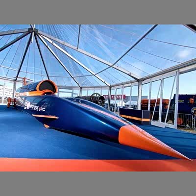 这款外观看上去犹如一款去掉机翼的战斗机“超级跑车”叫做“寻血猎犬”(Bloodhound),该车长12.8米,动力总成是由欧洲"台风"战斗机喷气式发动机和一种混合火箭发动机作为动力系统。 当推动力达到300英里/小时(约合483公里/小时)的时候,其就转换成为固液混合火箭。
