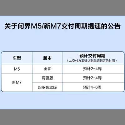 [汽车之家 资讯] 日前,AITO问界官方表示将持续努力提升产能,2023款问界M5和2024款问界M7各版本交付周期大幅缩短。自2024年2月21日至3月31日支付定金用户的预计交付周期(从交付方案确认到车辆到店的时间)如下:问界M5预计2-4周,问界M7两驱版预计2-4周,四驱版预计4-6周。