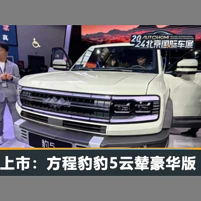 [汽车之家 新车首发] 4月25日,2024北京车展期间,方程豹豹5推出一款新车型——豹5云辇豪华版,该车的售价为32.98万起。豹5目前共有3款在售车型,售价区间28.98-35.28万元。作为方程豹首款车型,豹5基于比亚迪全新DMO超级混动越野平台打造,定位中型SUV。新车采用非承载式车身,中高配车型带有三把差速锁,顶配车型还配备云辇-P智能液压车身控制系统,动力系统则是由1.5T发动机和前后双电机组成。此外,官方表示豹5第二次OTA将于5月开启。塔漠米内饰颜色也同步开启订购。