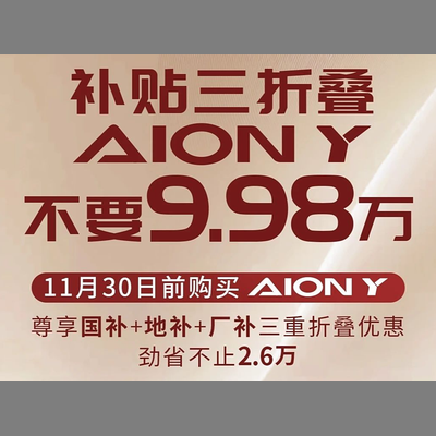 可省超2.6万元 11月30日前购买AION Y可享国补+地补+厂补三重补贴