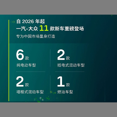 自2026年起,一汽-大众大众品牌和捷达品牌将在多个细分市场新增11款为中国市场量身打造的全新车型,包括6款纯电动车型、2款插电式混动车型、2款增程式车型及1款燃油车型。其中,一汽-大众将推动捷达品牌的电动化进程,首款纯电动车型将于2026年上市。首款捷达品牌纯电车型将搭载一汽-大众SOA电子电气架构。此外,在混动动力总成的合作开发过程中,一汽-大众也将发挥主导作用。