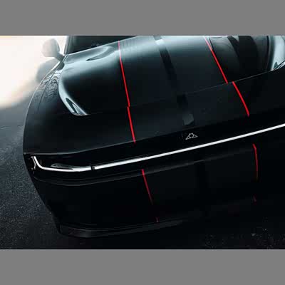 来看预告图,新车采用哑光黑车漆搭配红色条纹,车身上醒目的"Fratzog"徽标彰显身份。Fratzog是一个三角形徽章,最初由克莱斯勒在1960年代设计并使用。这个徽章由三组向外的箭头组合而成,形成一个三角形的图案。Fratzog徽章在1962年至1976年间被广泛应用于克莱斯勒的车型上,包括Polara 500、Charger、Monaco和Dart等车型。这个徽章通常出现在车头、方向盘或轮圈盖上,成为了道奇品牌黄金时代的象征。