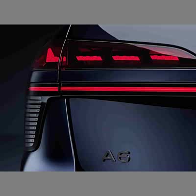 具体来看,新车将配备OLED尾灯组,上方为虚线造型,下方则是连贯的灯带,两侧还可以看到密集的梳齿状设计,整体造型十分科幻。新车还将配备运动风格后包围,采用黑色+银色设计,A6标志也采用黑色,很好地提升了车尾的层次感。