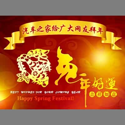 汽车之家的广大网友大家好!值此中国传统佳节2011农历辛卯年春节来临之际,汽车之家全体工作人员向关心和支持汽车之家网站的所有读者道一声:新春快乐,兔年大吉!祝大家身体健康、万事如意!