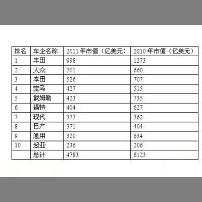 此外,戴姆勒从735亿美元下降至423亿美元,由2010年的亚军跌到第5。通用汽车则几乎缩水近半,从634亿美元锐减至320亿美元,前十名中只超过起亚。戴姆勒下跌的主要原因是全球卡车市场萎缩。