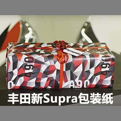 这款包装纸的设计灵感来自于丰田全新Supra原型车的迷彩伪装贴纸,纸上带有丰田Gazoo Racing的红、白、黑3色图案以及“A90”字样,即第五代Supra的底盘代号(前四代Supra的代号分别为A40、A60、A70、A80)。
