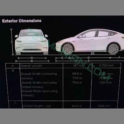 [汽车之家 新能源] 日前,有外媒收到匿名网友的邮件,里面包含了特斯拉Model Y目前还尚未曝光的一些信息。从中我们了解到该车的尺寸信息为4750/1921/1624mm,而Model 3的尺寸为4694/1850/1443mm(未包含后视镜宽度,如包含后视镜宽度为2129mm),可以看出该车高度相比Model 3有明显提升。