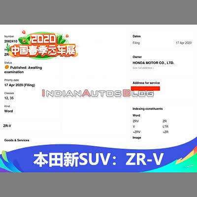 [汽车之家 新闻] 近日,有媒体称从世界知识产权组织(WIPO)的数据库中,可以查询到本田在今年4月中旬左右提交了“ZR-V”的商标注册申请。据相关信息分析,本次注册的“ZR-V”有可能会是一款入门级的SUV。