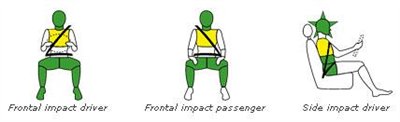 图为碰撞时车内驾乘人员受伤情况 三幅图依次为正面碰撞驾驶员、副驾驶员、侧面碰撞驾驶员