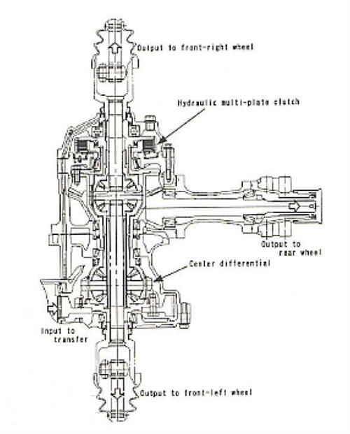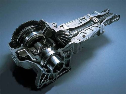 对于前纵置发动机来说,变速箱在前轴之后,动力总成通过变速箱输出后,直接进入中央差速器,此时中央差速器处在车体的中部,那么再由布置在动力总成后部的中央差速器分配给布置在前轴和后轴的前后差速器,就非常方便了。那么对于前横置发动机来说,变速箱与曲轴平行的布置在前轴之前,动力如何传递给中央差速器呢?如果还是按照传统的布置方式,通过伞形车轮传递到中央差速器,那么在将中央差速器传递到前轴时会遇到问题,因为传统的前置前驱的变速箱是与前差速器直接通过齿轮接通的。