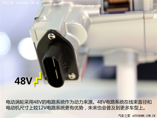 电动涡轮没有了排气端的涡轮,所以整体体积要比传统涡轮小很多。从结构上来讲,这个装置取消了废气涡轮而用电机代替,只保留了负责进气端叶轮,所以从机械角度叫它电子叶轮更为准确,不过从分类角度来说,我们还是跟随官方把它称为电动涡轮,更通俗易懂。