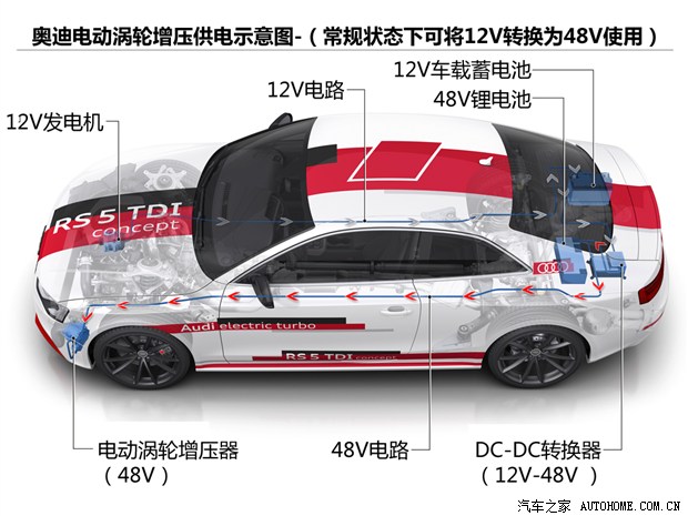 可能有人会问:电动涡轮是需要电能支持的,那用于涡轮动力来源的电能消耗是否会抵消它所提升的动力?对于这个问题奥迪在研发中也给出了解决方案,除了可以用DC-DC转换器将12V的常规蓄电池的电压转换成48V电压使用之外,还融合了刹车动能回收技术,利用这些发动机之外的动力来帮助电动涡轮提供电能。