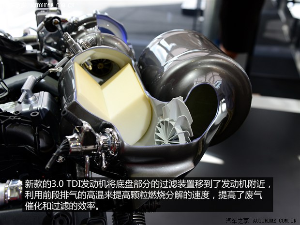 奥迪新款TDI发动机在排放方面的优化是:将之前安置与底盘部分的过滤系统改在靠近发动机的位置,这套过滤系统包含了三元催化剂、尿素(AdBlue)喷射系统和颗粒过滤器,可以利用前段排气的高温来提高颗粒燃烧分解的速度,提高了废气催化和过滤的效率。
