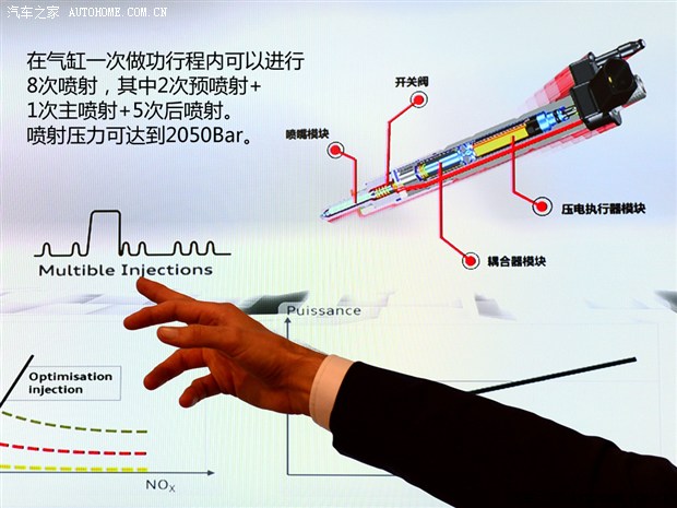 对于柴油机来说,多次喷油可以改善噪音和有害物质的排放。在主喷射之前有两次预喷射,这可以降低气缸内的温度来减少氮氧化物的排放,同时也可以减小柴油发动机在工作时的“哒哒”声,而在主喷射之后还会有几次连续的小喷射,这可以减少废气中颗粒物的排放,同时这项技术可以针对每个气缸的情况单独计算出每次的喷油量及精确的喷油时间,提高燃油经济性。