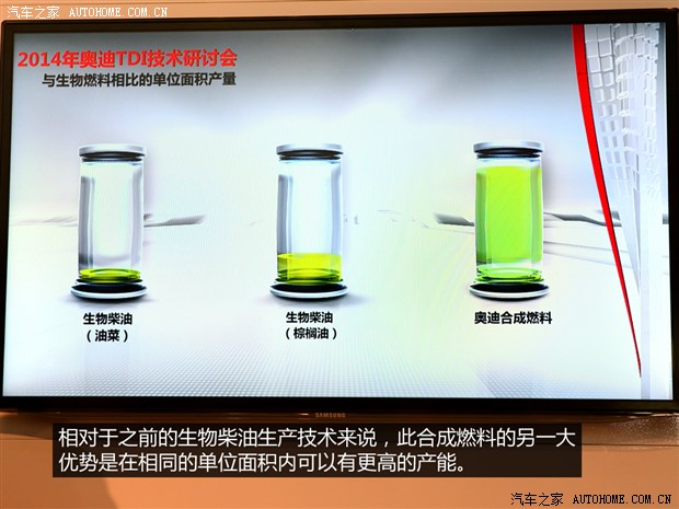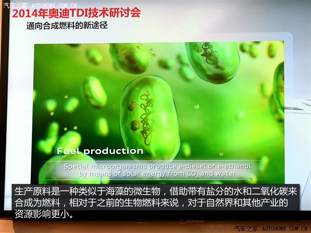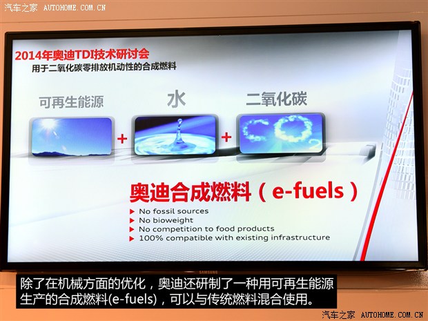 奥迪在柴油发动机领域的研发,除了机械本身,在燃料方面也有所进展,目前已经研发出了一种用可再生能源+水+二氧化碳合成的新燃料(e-fuels),此燃料不会破坏传统能源、生物能源,也不会干扰食品生产,并且可以与现有的材料混合使用。