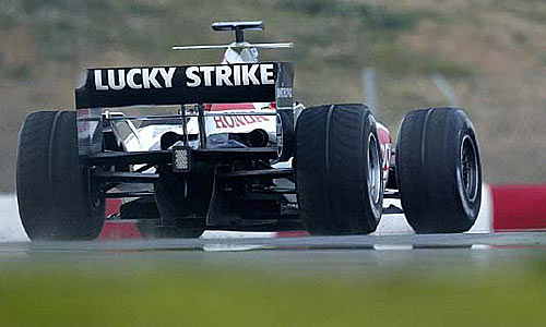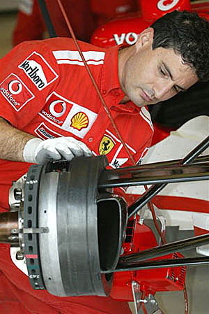 为加大制动力,F-1赛车不像普通汽车那样采用鼓式制动器,而是采用双管路式的制动卡钳(凭两个或四个活塞推动)。制动器底盘则采用碳化合物制成,这样既可获得高的摩擦系数,又可耐高温。