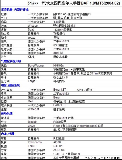 ㊣另外一台比较有特点的参赛车辆是来自广州赛区的四代高尔夫,车主Ben在高尔夫改装圈子里也算是很有名气了。看看下面这个改装清单,这台车的状况一目了然。这台车也是南方地区改装风格的代表,除了原厂和各大改装厂的部件外,车主还DIY了很多自制部件。另外一个明显特点就是车主更注重二次升级,也就是在更换发动机的基础上,再进行进排气研磨,强化活塞连杆等工序,来实现更高的动力输出。
