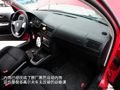 这台红色四代高尔夫的内饰改装也是很典型,首先是将米色内饰换成欧洲的全黑运动风格。挡杆,方向盘也都换成GTI,力求贴近原厂风格。对了,一台能与发动机良好匹配的变速箱也是必不可少,大众的MQ250就是最合适的选择,六速MQ350更是极品。