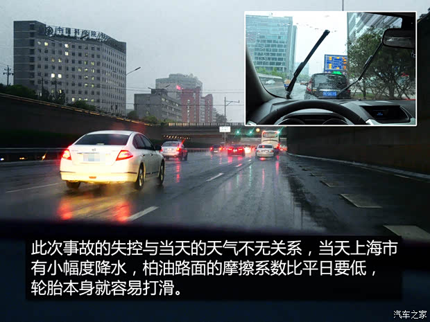 当天上海的天气有小幅降水,市中心路面比平时要湿滑一些,加上温度低、风力大,总之这种天气驾车危险系数比平时要大一些,所以发生事故的黑色SUV打滑与路面附着力小有很直接关系。