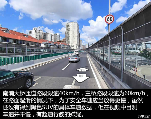另外,熟悉这条路的朋友都知道,桥梁上的南浦大桥上的限速为60km/h,但由于桥面上没有摄像头,很多人嫌60km/h的车速慢,都纷纷超速行驶。虽然我不能肯定地说这辆SUV发生事故时到底超没超速,但目测是很有超速嫌疑的。我在这里想强调的是,所有道路的限速设定的时候,都有它的道理,不要老在心里想有的大马路那么宽怎么还设那么低的限速,多数事物还是存在即合理的,限速都是通过这种实际实验的结果最终判定出来的,不必非要牺牲安全去节省那几分钟的时间而超速。