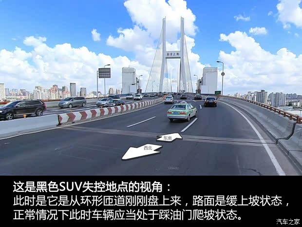 首先是车辆失控的位置是从环形匝道刚刚盘上来进入主桥的位置,那么这辆SUV在失控前还是处于上坡的状态,这时候驾驶员普遍都是加大油门前行,这也是正常的。