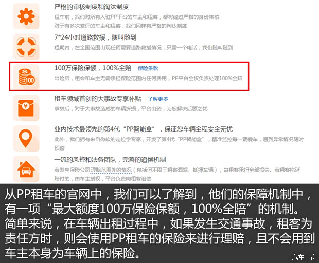 需要说明的是,PP租车的100万保险保额,是平台上的每一辆车都会享受这个额度的,这个赔付金额可以说能够解决大部分的赔偿事宜了。不过在租客缴纳保险费用时,会有一些不同,简单来说就是,25岁以上且两年驾龄以上的租客,所要缴纳的保费少一些,为租车金额的20%;而25岁以下或两年驾龄以下的租客,所要缴纳的保费为租车金额的30%,相对较多。