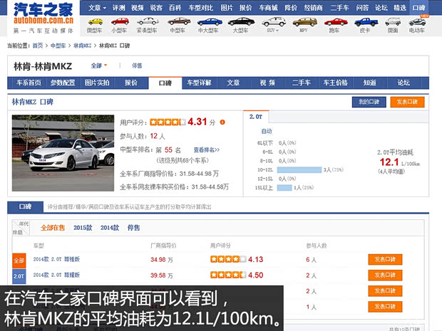 工信部给出的MKZ油耗为2014款 2.0T 尊享版为7.6L/100km,2014款 2.0T 尊雅版为7.7L/100km,2014款 2.0T 尊耀版和2015款 2.0T 总统系列均为7.8L/100km,而根据汽车之家的网友口碑系统,实际MKZ的油耗为12.1L/100km。