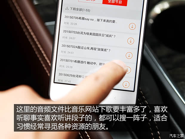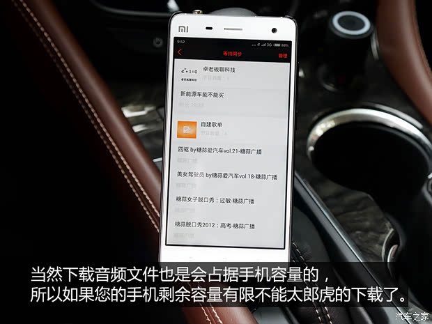 操作是难是易,都是相对的,单看这个产品来说,连接操作并不很麻烦,但要是跟U盘插到USB接口中、手机与车机进行蓝牙连接相比,在操作上还是多了那么一步思考的过程,因为平台上的音频资源比在网站上下歌丰富多了,你也许会花更多的时间去选择到底该听什么节目,适合习惯经常在网上寻觅各种资源的朋友们。