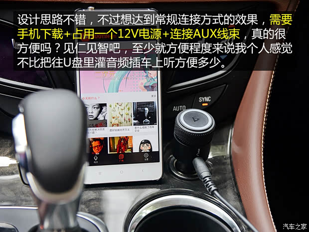 FM波段的杂音和串台实在是太让人不爽!第二天果断连上一根AUX线,才舒服一些,如果您的车上有AUX接口的话,就踏踏实实的连根线,至少这样声音是纯粹的,对于听听脱口秀这样的节目够用了。