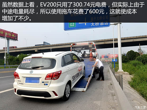 如果只看数据的话,除了MODEL S,EV200在电费的花销是最少的,但在实际过程中,该车本身就带有充电保护的设置,在快速充电桩充电时,只能充80%的电;而在山东新泰充电站开始,车辆的行车电脑频繁出现故障码,充电时也只能充60%。而行驶至离江苏泰州宣堡充电站3公里时,EV200耗尽电量,抛锚在高速公路上,我们的工作人员只能打电话叫拖车。