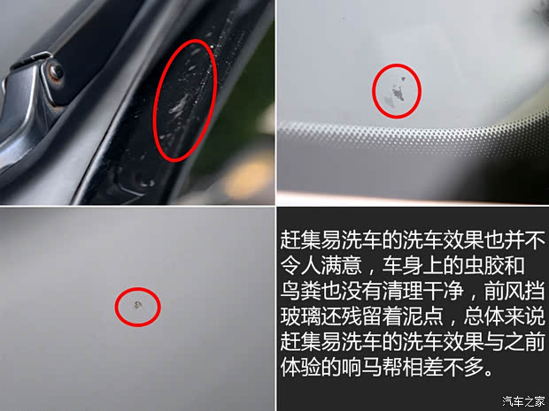 赶集易洗车的洗车效果也差强人意,除了前风挡玻璃上的泥点没有清洗干净外,车身上的一些虫胶和鸟粪也没有清洗干净,效果和之前的响马帮差不多。