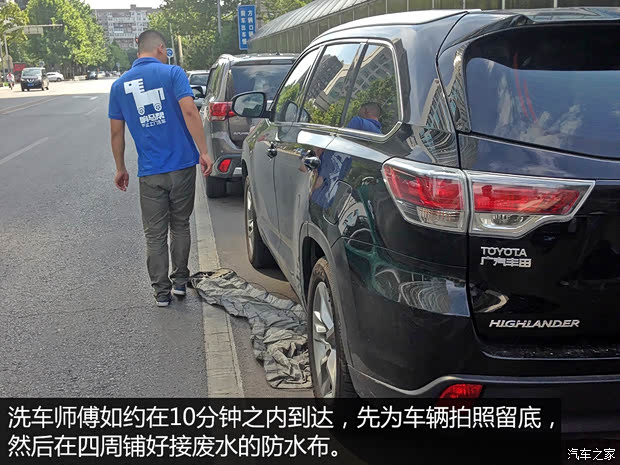 我们这次为响马帮准备的体验车辆为丰田汉兰达,已经有两周的时间没有洗车,整体较脏,车身除了大量灰尘外,还有一部分泥点。与我们联系完后,洗车师傅如约在10分钟内到达预约地点,并对我们的车辆进行拍照。