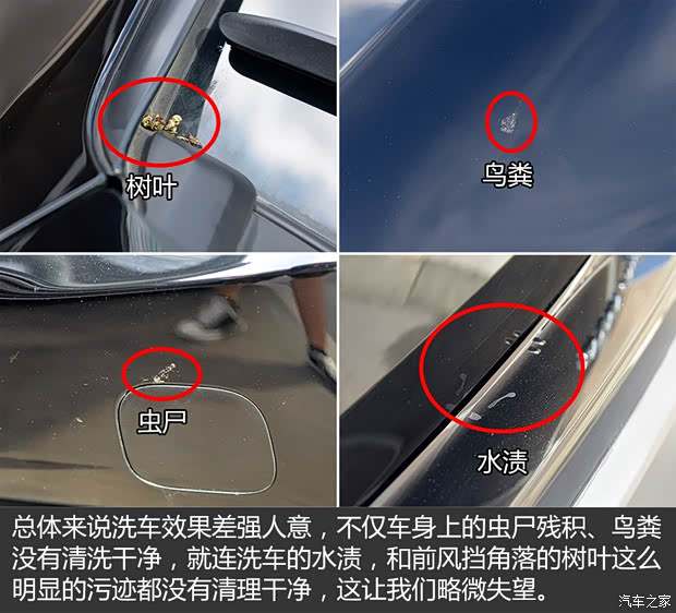 从洗完车后的效果来开,并不能让我们满意,车身上的一些顽固污渍,例如鸟粪、虫尸等并没有清洗干净;不仅如此,就连非常明显的树叶和洗车后的水渍都没有清理彻底,这种结果令我们失望,看来响马帮的基础业务能力还是需要加强。