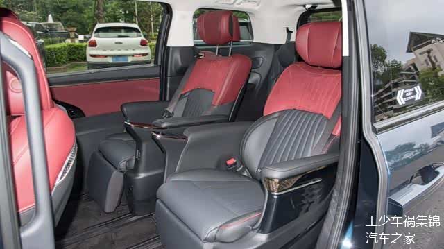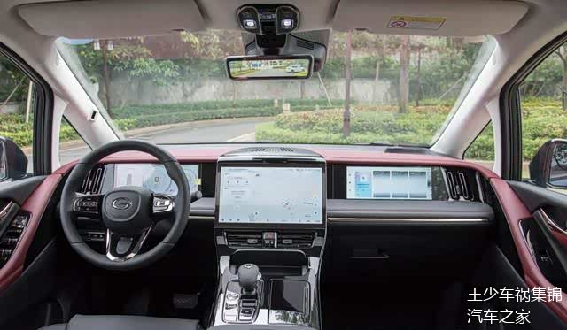 内饰设计布局还是印象中传祺M8的样子,只不过在内饰配色上有一定区别,为营造出环抱式视觉效果,中控台和门板内侧包裹不规则红色饰板,连接在一起后形成起伏不平的视觉效果变化。屏幕内分区集成丰富科技功能,功能性没有问题,但系统响应速度和操控逻辑还有待提升。