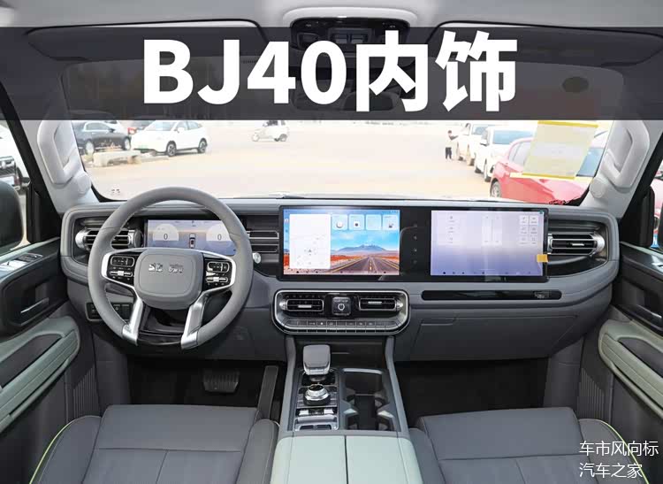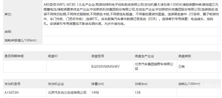 申报图上并没有内饰图片,但此前该车的内饰照片曾被曝光,整个中控台的造型跟原先的燃油版本并没有太大的区别,配备三辐式多功能方向盘、全液晶仪表,档把造型和驾驶模式选择旋钮都保持一致,空调出风口位置调整,且与下方的物理按键在同一区域,不过最明显的变化还是中控台的大屏幕换成了贯穿副驾的大尺寸双联屏,这很符合新能源车型的特征,整套内饰采用软性材质包覆,看上去豪华感不差,具体可参考BJ40。