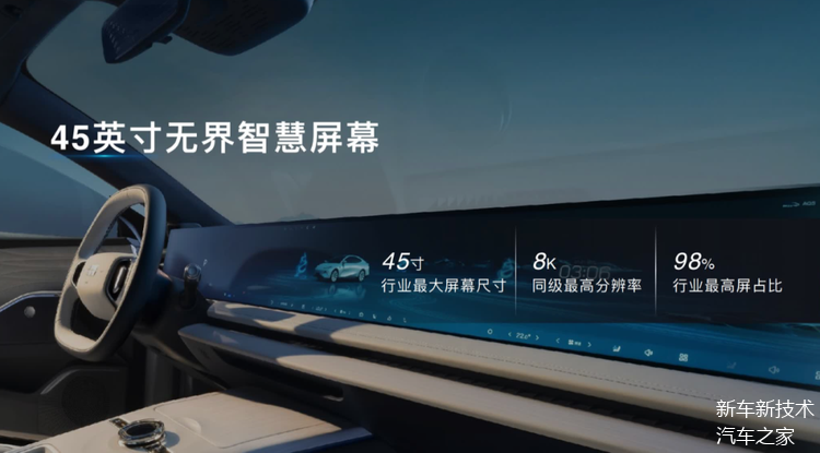 对于智能电动车,大家最普遍的一个印象就是“大电视”,不过相比于市面上普遍使用的15英寸、16英寸,甚至是13英寸的屏幕,银河E8直接把屏幕尺寸拉满,全系标配了全球首发的45英寸的8K无界大屏。