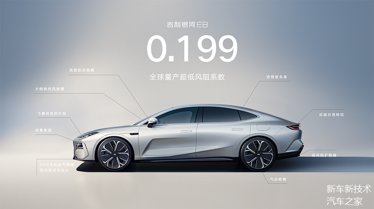 另一方面,得益于低趴车头、流线型车身、外置式AGS主动进气格栅、低风阻封闭气动轮辋等全车25处低风阻设计,银河E8风阻系数仅0.199 Cd。要知道,此前轿车风阻系数最低的可是奔驰EQS的0.20Cd,至于特斯拉Model 3和蔚来ET7,则分别是0.23Cd和0.219Cd。