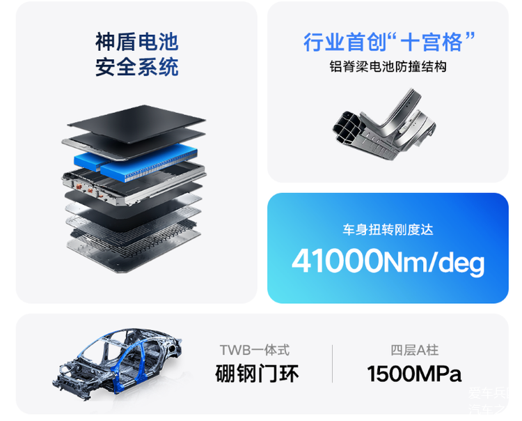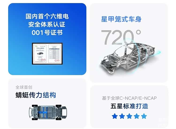 安全上,银河E8的神盾电池安全系统,打造了一整套从电池到架构、整车、智控、云端的四层“无盲区”安全防护系统,电池单项试验高于国标要求的基础上,让同一块电池经历温度冲击、湿热循环、振动、机械冲击、浸水安全、IP6X、IPX8和IPX9K等“铁人八项”魔鬼测试,并做到连续试验一次性通过。车身采用的全球首创“蜻蜓”传力结构、航天级7系铝合金“Ω”防撞梁结构以及“三叶草传力结构”等专利,则将车身安全做到了同级最强。