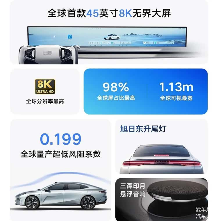 造型上,银河E8采用了“涟漪美学”的全新设计语言,打造了全球首个量产一体式发光前脸,风阻系数也做到了全球量产车最低的0.199。
