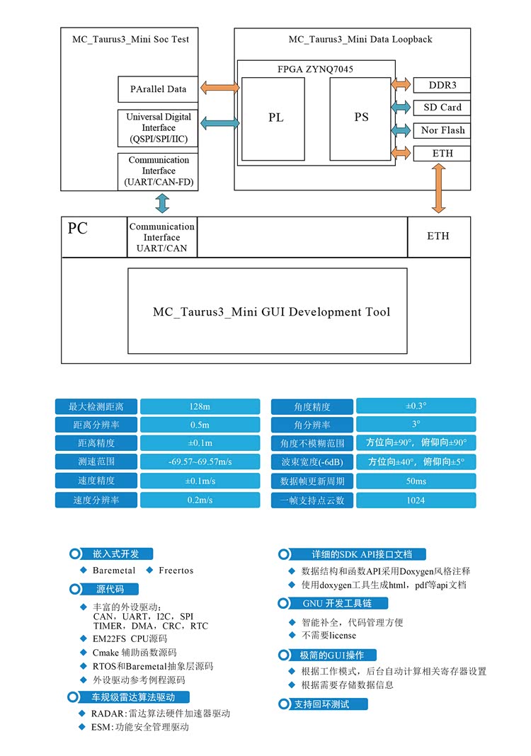 Taurus3-mini是一款覆盖76~81GHz频率范围的车规级SOC毫米波雷达处理芯片,集成有4发4收毫米波雷达射频前端,高度灵活可配置的硬件雷达算法处理器,丰富的功能安全检测机制,通过极简的软件编程即可支持雷达系统应用方案。适用于高可靠性、低功耗、高性价比的车规级毫米波雷达应用