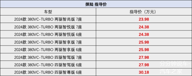 从实用性和配置表现来看,笔者优先推荐指导价27.98万的2024款 380VC-TURBO 四驱智驾版,至于是6座还是7座就看你个人需求了,两个座位版本的价格是一致的。